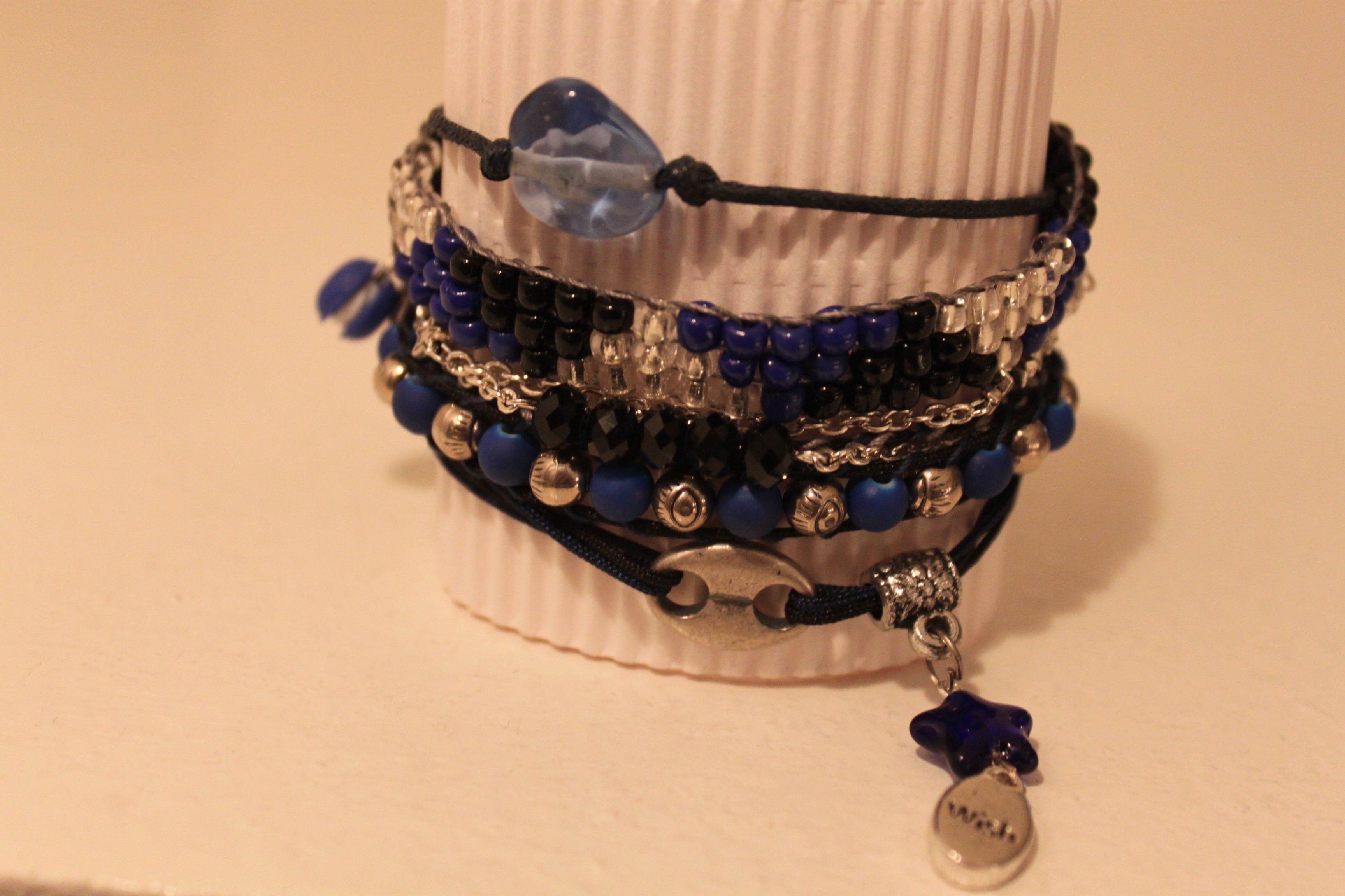 Manchette turquoise : pièce unique fait main à base de récupération (« upcycling ») C’est à dire que les perles rectangulaires proviennent d’un bracelet cassé. Les anneaux argent/turquoise sont des boucles d’oreilles (B.O.) également cassées que j’ai utilisée pour cacher les accroches des chaînes et autres rangs de perles. Avec la deuxième B.O. j’ai fait une bague assortie.