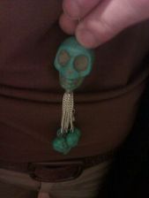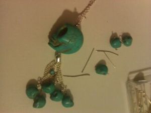 Manchette turquoise : pièce unique fait main à base de récupération (« upcycling ») C’est à dire que les perles rectangulaires proviennent d’un bracelet cassé. Les anneaux argent/turquoise sont des boucles d’oreilles (B.O.) également cassées que j’ai utilisée pour cacher les accroches des chaînes et autres rangs de perles. Avec la deuxième B.O. j’ai fait une bague assortie.