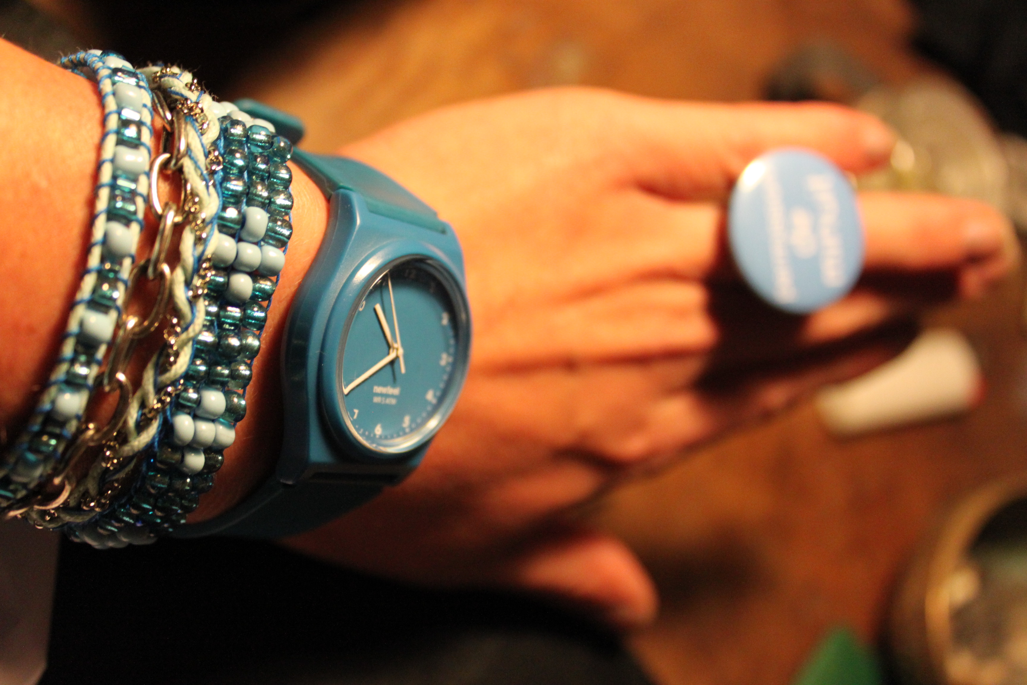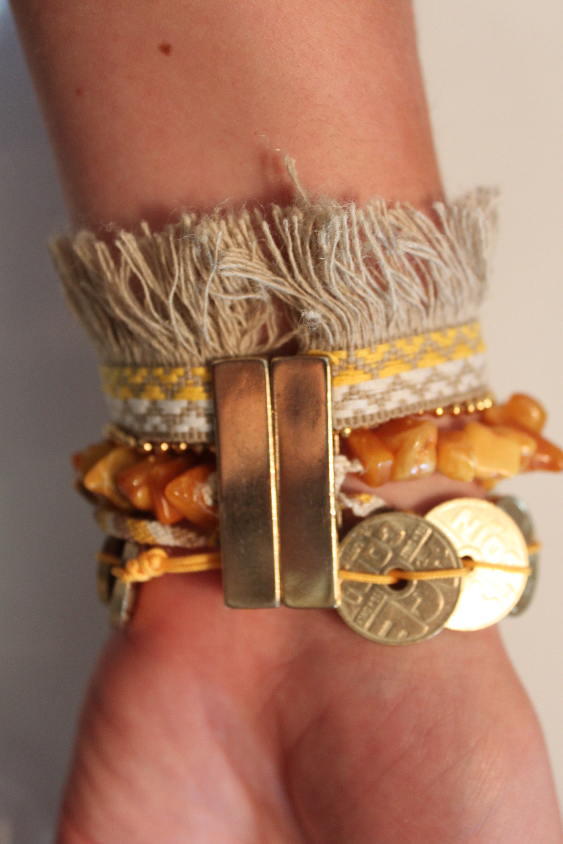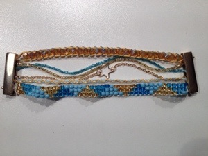 Un nouveau bracelet manchette fait en doré et turquoise pour l’été. Les différents rangs sont :
